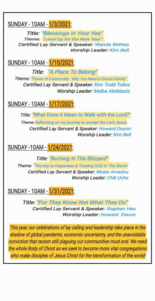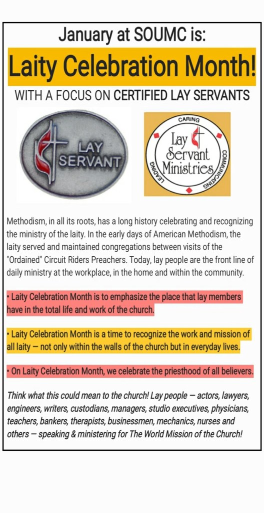 January 2021 is Laity Celebration month at SOUMC! Please join us. Share this: Share on X (Opens in new window) X Share on Facebook (Opens in new window) Facebook Like Loading...